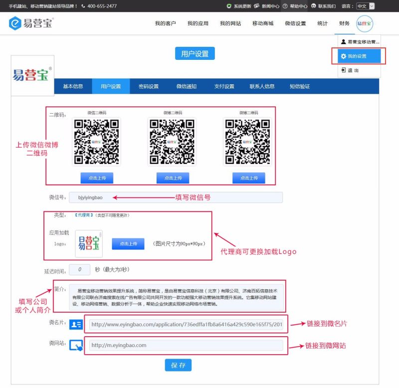 1. 登录易营宝后,点击右上角的头像,选择“我的设置”——“用户设置”。在用户设置里,可以上传微信、微博二维码,填写公司或个人简介,链接微名片和微网站。另外,代理商权限可以更改加载Logo。