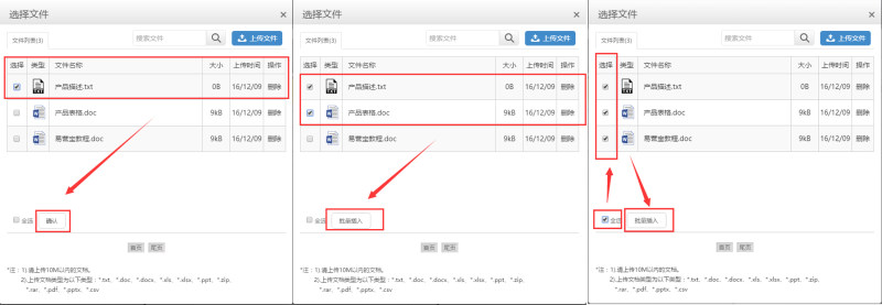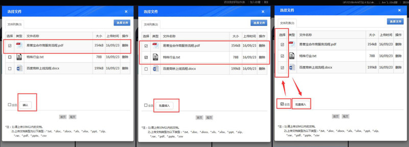 选择一个文件,选择确认;选择两个及以上文件,选择批量插入;如果所有上传文件都需要,则点击全选,然后选择批量插入,如下图: