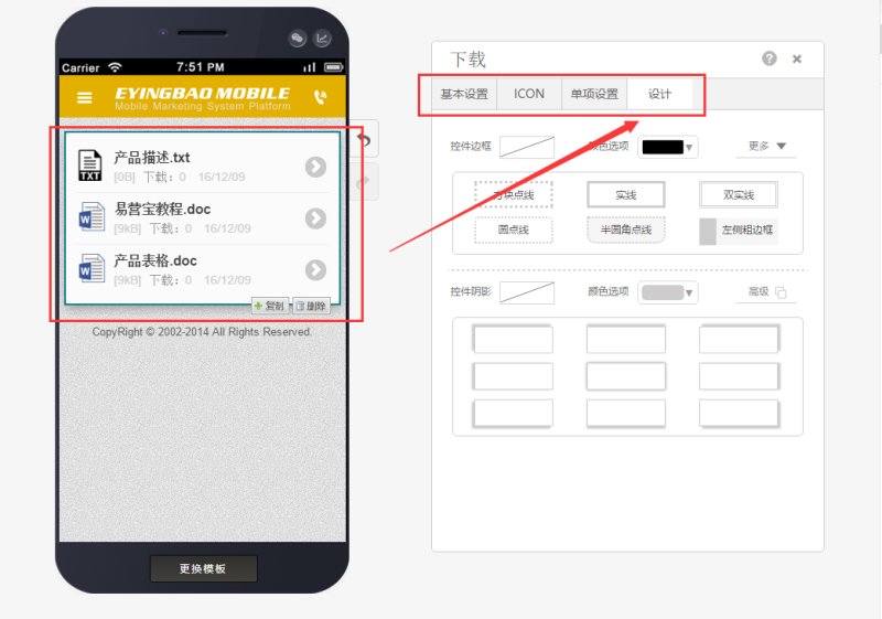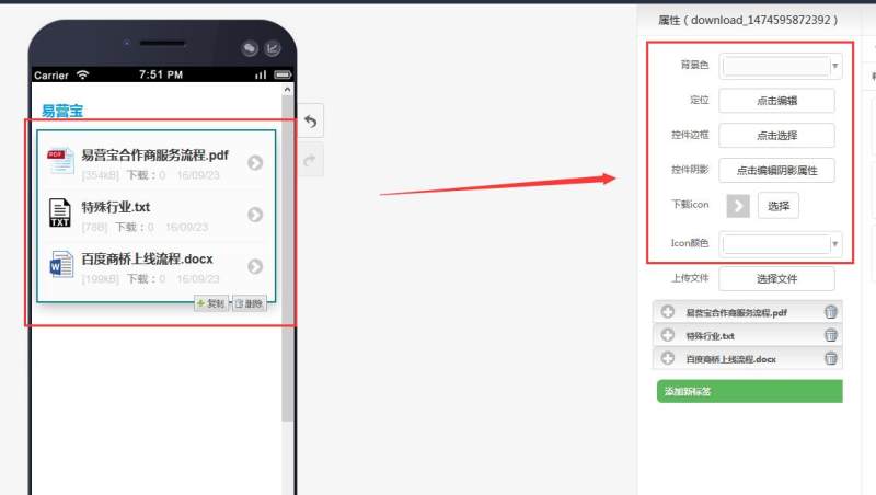 第五步:左侧选中下载控件,右侧会显示此控件属性,红框内的属性,可以根据自己的需求进行操作,美化,如下图: