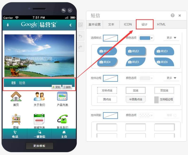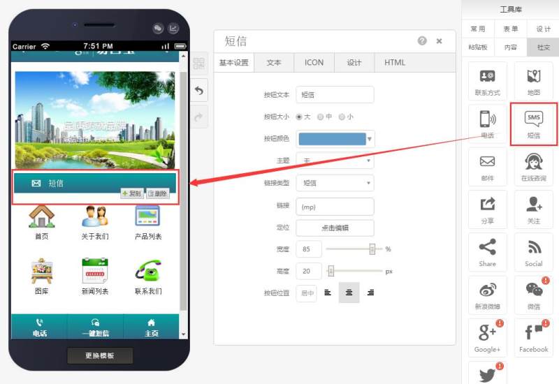 在页面中添加短信控件,有多种样式可选,还可自定义图标。