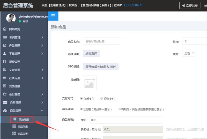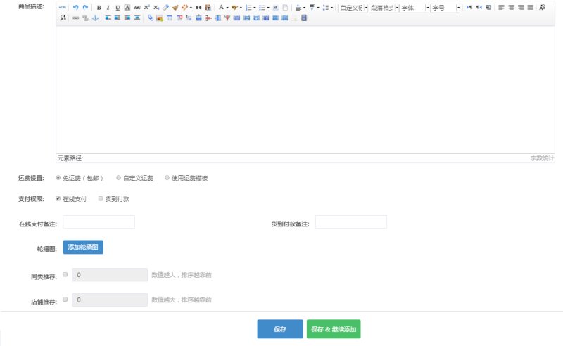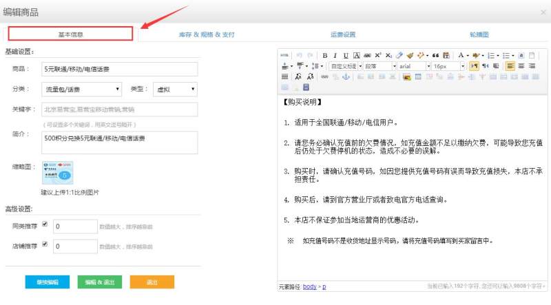 ③按照页面上的提示,填写商品基本信息,包含商品名称,商品分类,支付方式,商品规格参数,商品价格和库存,商品运费,商品详情等。如下图: