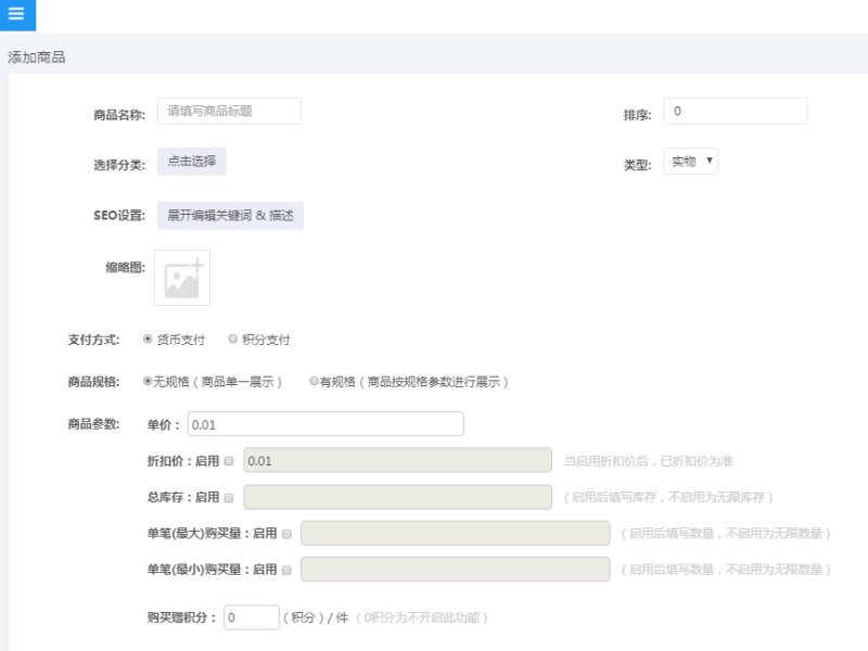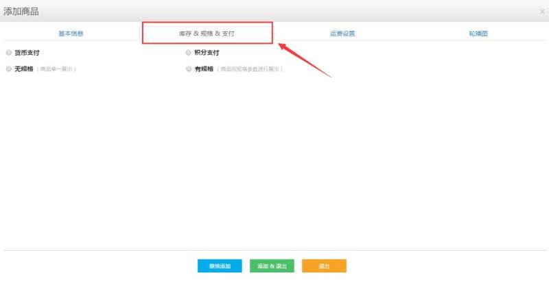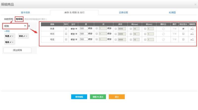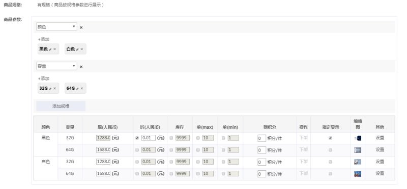 ④对于有规格的商品,在商品规格这里,选择有规格,然后添加即可,添加商品规格后,可以针对同一商品的不同规格设置价格、库存等。如下图:
