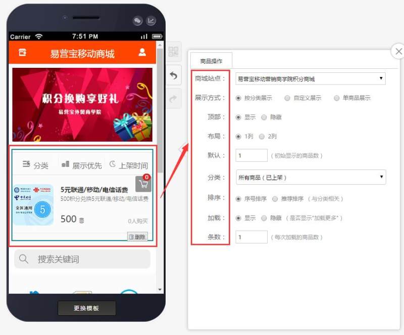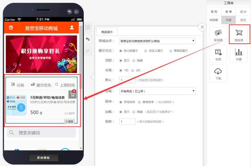第二步:编辑完商品后,进入商城编辑页拖入商品源控件,,如下图: