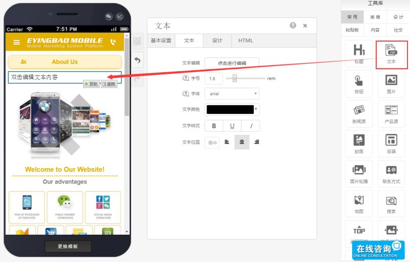 使用流程:在工具库中找到“文本”控件,并拖入编辑页。