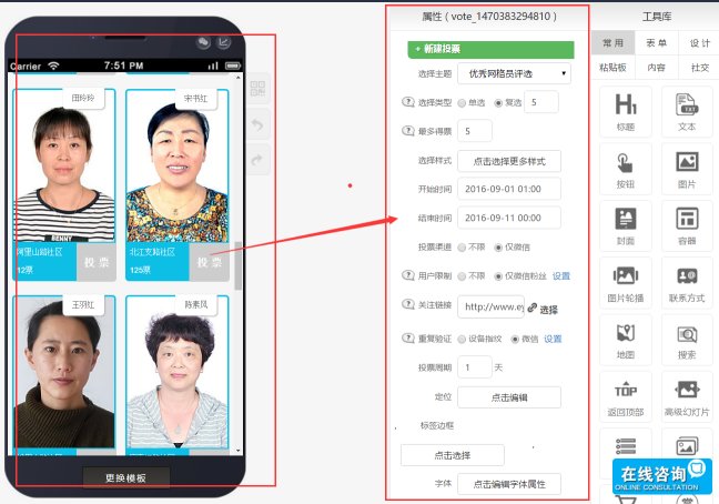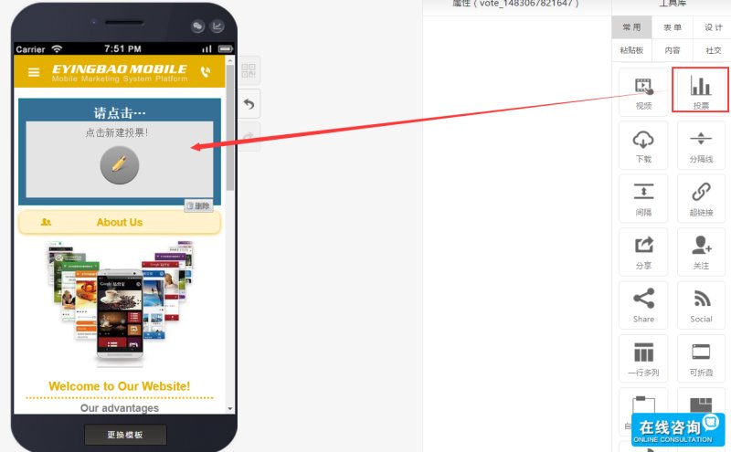 使用流程:在工具库中找到“投票控件”并拖入编辑页。