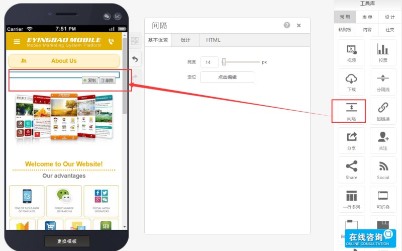 使用流程:在工具库中找到“间隔”控件,并拖入编辑区。