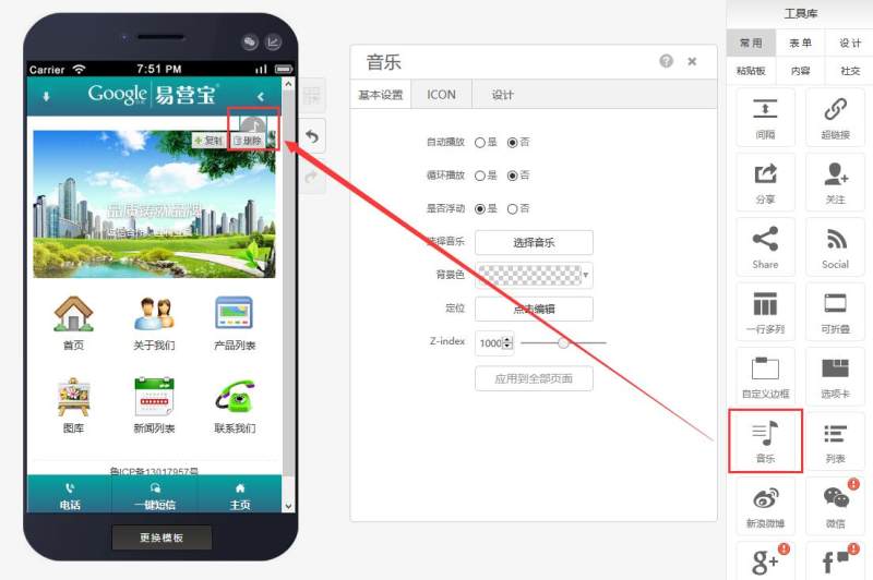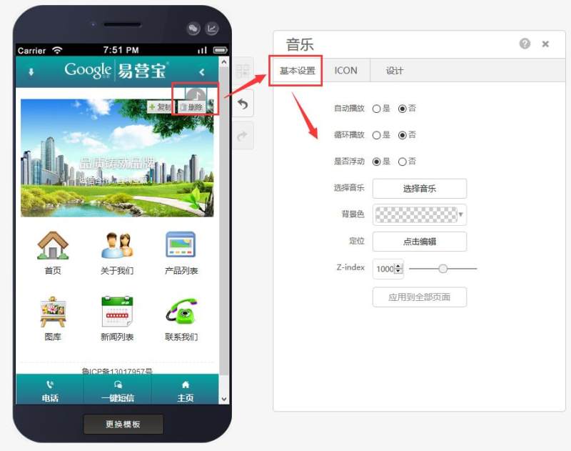 第三步:在基本设置中,选择是否自动播放/循环播放/浮动、音乐及背景色、定位和层级,如下图: