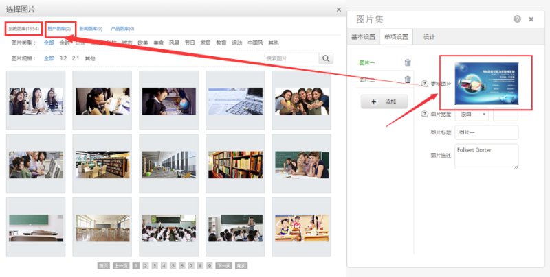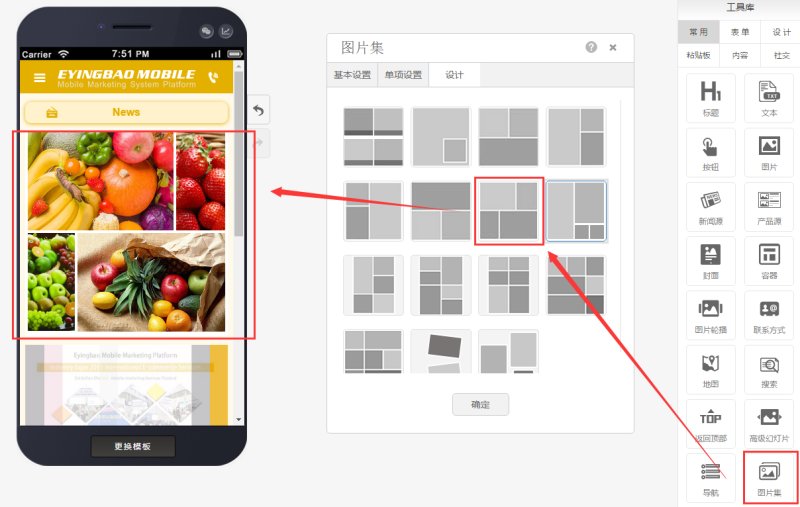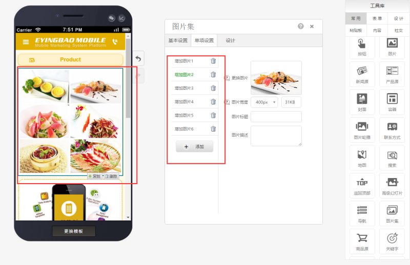 第一步:拖拽图片集控件到易营宝页面中,选择显示个数或者相应的图片集样式,默认个数是2,如下图:
