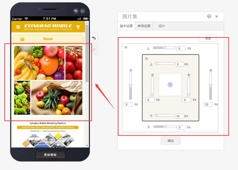 对于一个移动站点来说,图片相较之文字表现力更强,能够给访问站点的用户带来更好的视觉效果和体验。互联网发展到现在,无论是web还是移动站点,图片的使用都占据了网站设计、制作以及运营很高的比例,所以好的图片展示形式对站点来说至关重要。易营宝的图片集控件则能够满足用户在页面上显示不同样式图片的需求。使用效果大致如下图: