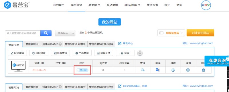 1、在我的网站列表里,找到要上线的网站,点击状态按钮