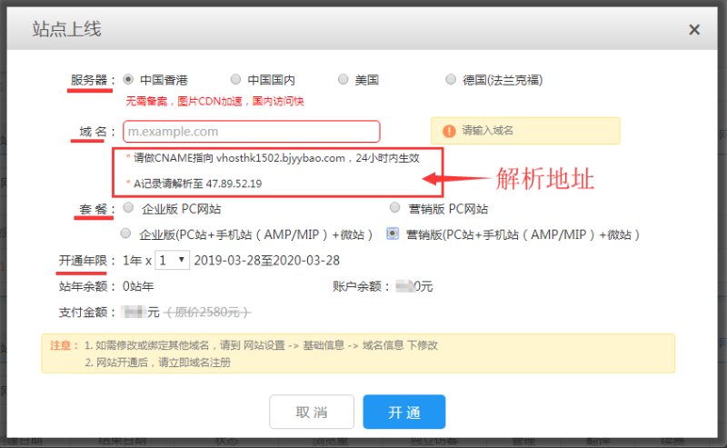 2、在弹窗里选择服务器,填写要绑定的域名,选择上线的套餐和开通年限,点击开通即可。