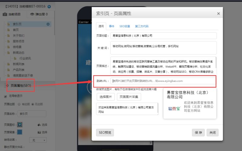 2、如果客户想要实现在PC端访问移动站域名时自动跳转到PC站,可在移动站编辑页面-页面属性-跳转URL里填上PC站域名,然后保存发布即可。