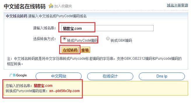 1,登录中文域名转码网址:http://www.webmasterhome.cn/tool/punycode.asp 在“请输入域名串”中输入您自己的中文域名,在选择转换方式处选择"转成PunyCode编码”,然后点击“在线转码”,您就可以看到转码后的字符串。如下图: