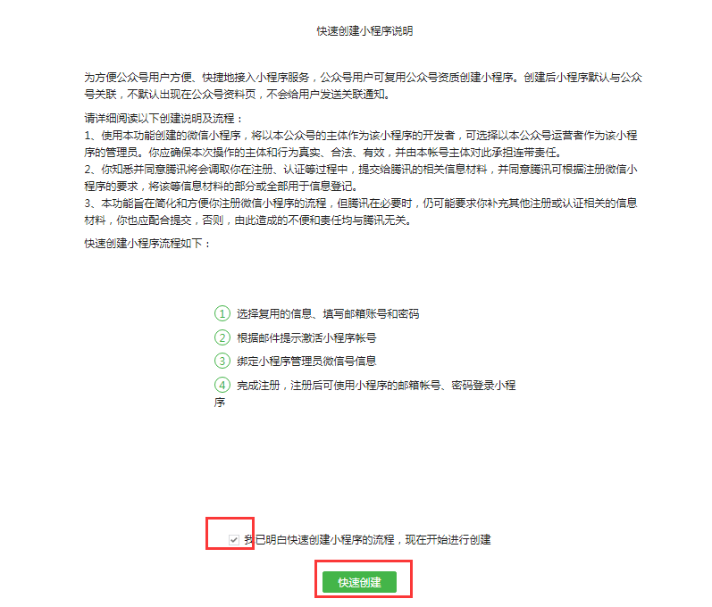 3, 仔细阅读快速创建小程序说明并勾选“我已明白快速创建小程序流程,现在开始进行创建”,点击快速创建