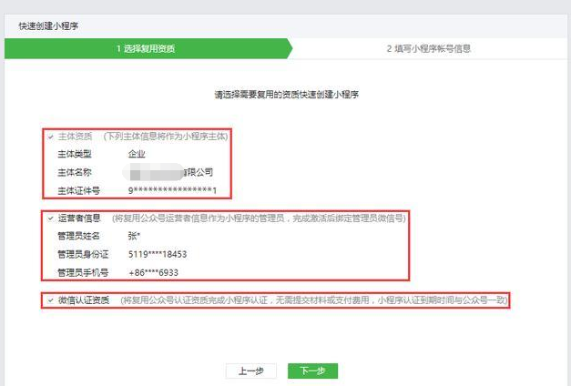 5, 确认之后点击返回,确认复用资质(公众号认证资质)全部勾选之后点击下一步