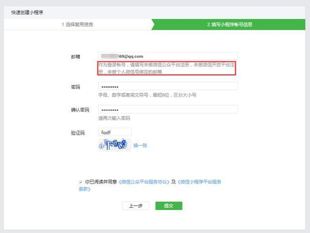 6, 填写账户信息(邮箱必须是没有注册过微信公众平台的),并完成邮箱验证