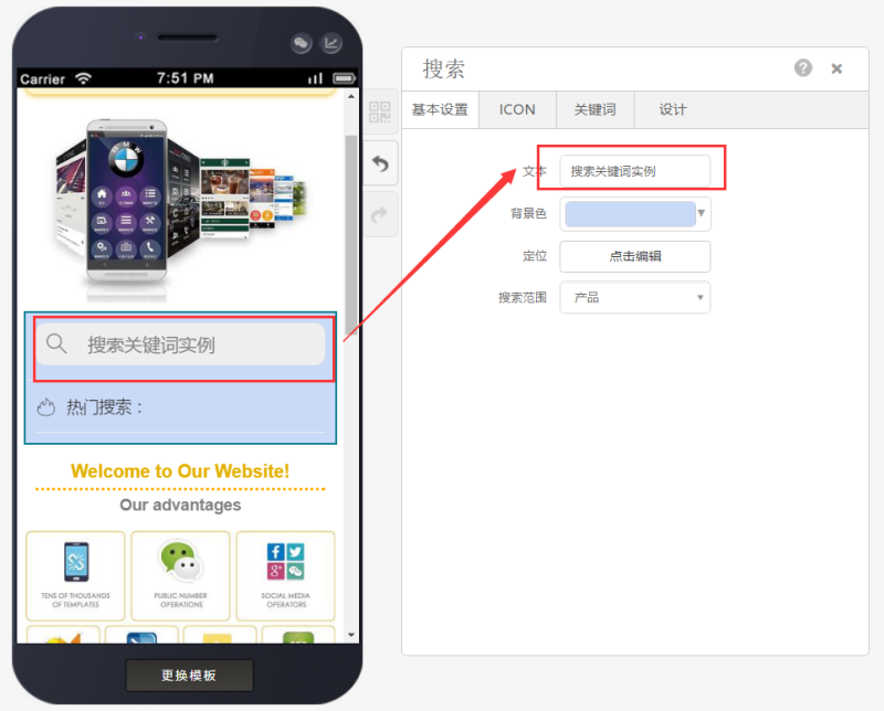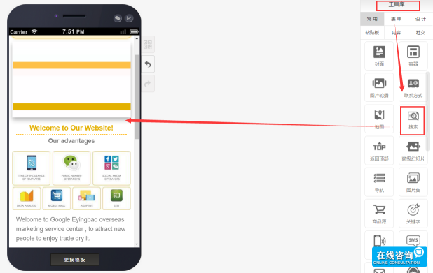 操作流程:在工具库中找到“搜索”控件,拖拽至编辑页,放在想展示的区域。