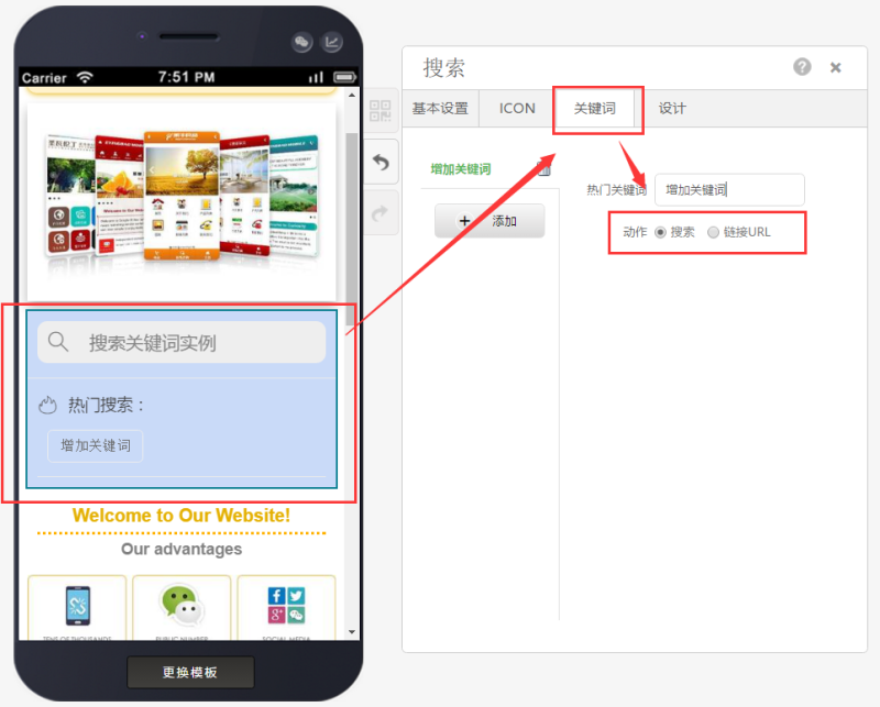 可以添加关键词,选择URL跳转,用户点击的时候可以直接跳转到的所设置好的超链接中。