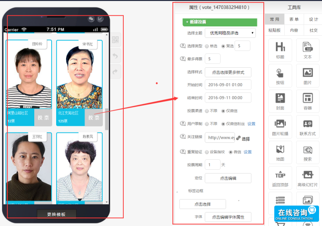 使用流程:在工具库中找到“投票控件”并拖入编辑页。