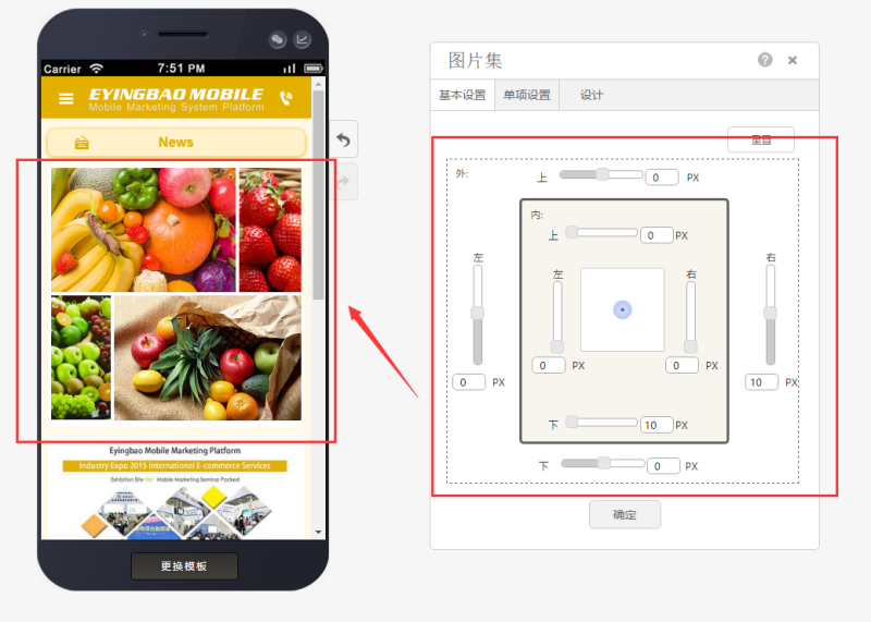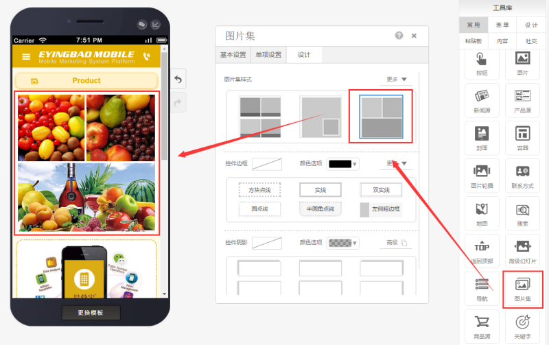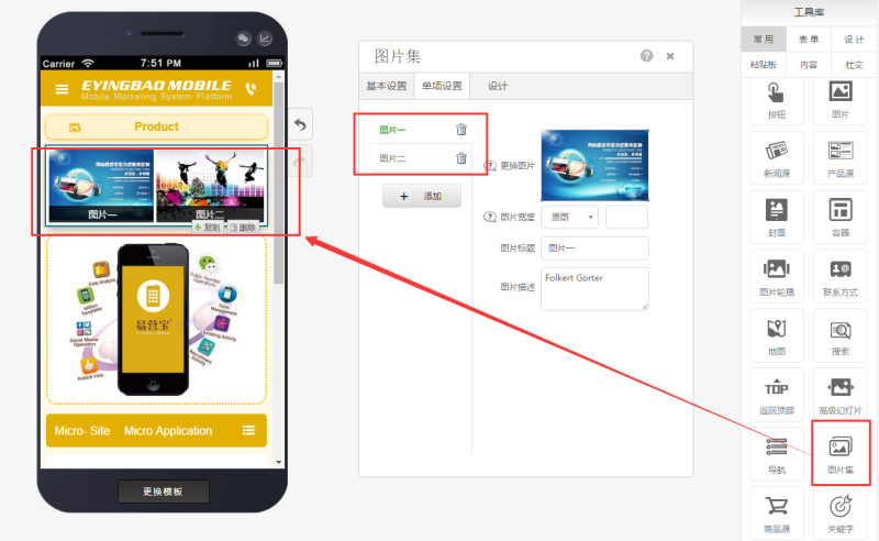 第一步:拖拽图片集控件到易营宝页面中,选择显示个数或者相应的图片集样式,默认个数是2,如下图: