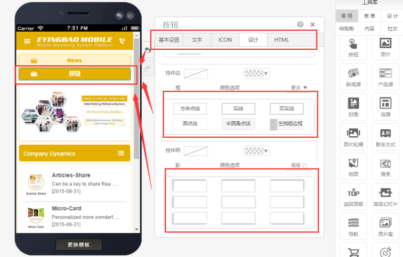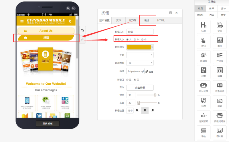 在页面中添加按钮控件,有多种样式可选,还可自定义图标。