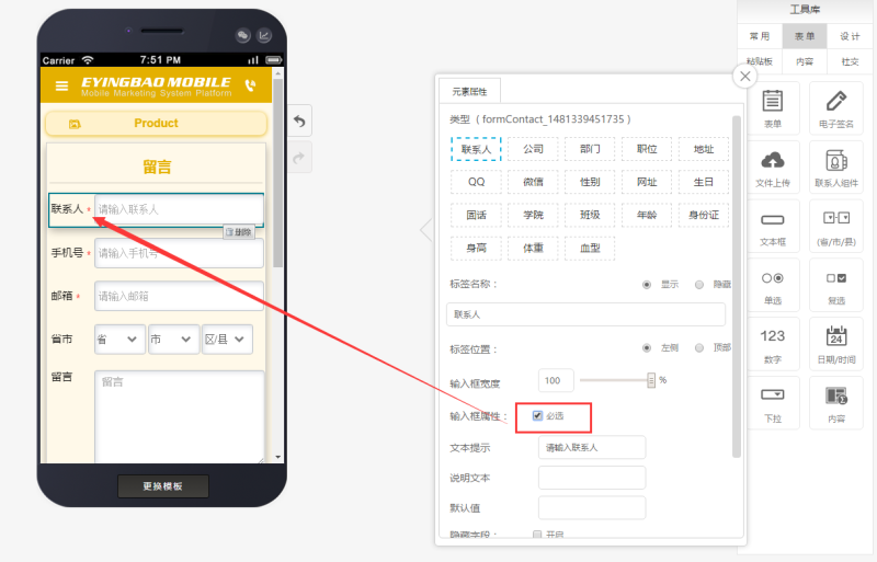 第三步:根据自己的需求对表单内部的每个元素进行编辑,如下图:
